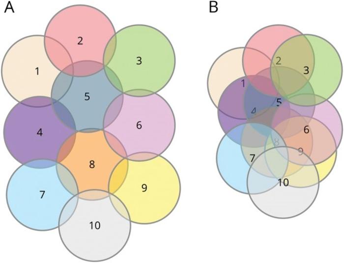 每个编号的圆圈代表一个不同的生物实体或疾病。左图是一个需要重建的模型。虽然这些疾病是相互关联的,但它们大多是独特的;大多数生物元素是不重合的。根据这个模型,如果α-syn是所有或大多数形式的PD所共有的,那么它不可能对每种形式的PD都有致病性。右图,是修订后最合适的模型。所有的疾病都有更多的共同点;鉴于大量的重叠,它们的独特性大多只是理论上的。这个模型并不排除α-syn在许多或所有形式中的潜在重要作用;可能对一个遗传性PD亚型有效的疗法也可能对其他类型的PD亚型有效。该模型还可以解释PD可能涉及多个通路,如果能修复其中一个通路,我们可以将散发性PD推迟几年。
