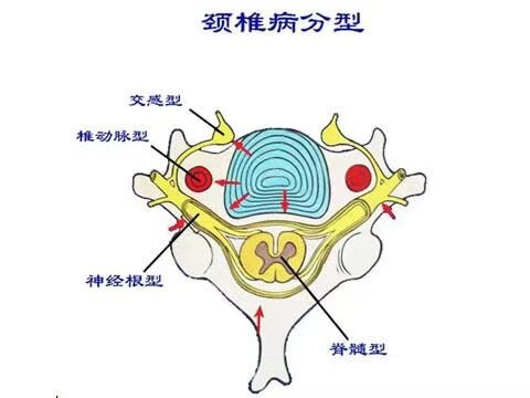 颈椎病又称颈椎综合征,是颈椎骨关节炎、增生性颈椎炎、颈神经根综合征、颈椎间盘脱出症的总称,是一种以退行性病理改变为基础的疾患。主要由于颈椎长期劳损、骨质增生、椎间盘脱出或韧带肥厚,致使颈椎脊髓、神经根或椎动脉受压,出现一系列功能障碍的临床综合征。表现为椎节失稳、松动;髓核突出或脱出;骨刺形成;韧带肥厚和继发的椎管狭窄等,刺激或压迫了邻近的神经根、脊髓、椎动脉及颈部交感神经等组织,引起一系列症状和体征。