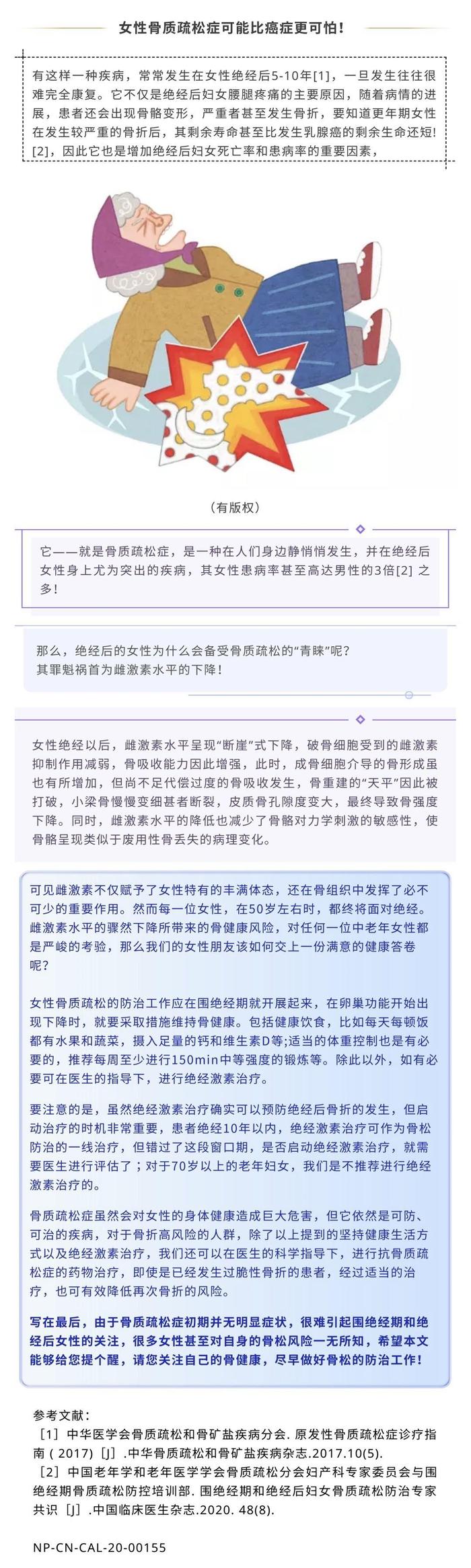 女性骨质疏松症可能比癌症更可怕! 2021年04月29日 9906人阅读 有这样一种疾病,常常发生在女性绝经后5-10年[1],一旦发生往往很难完全康复。本文旨在科普教育,不构成疾病诊疗建议。如您有任何针对个人的有关疾病的预防、诊断、治疗需求,请咨询您的专业医生 顶 0 分享到: