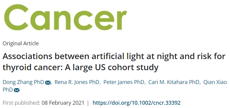 2021年2月8日,德克萨斯大学Xiao Qian及阿肯色大学Zhang Dong共同通讯在Cancer 在线发表题为”Associations between artificial light at night and risk for thyroid cancer: A large US cohort study“的研究论文,该研究对来自美国国立卫生研究院-美国退休人员饮食与健康研究协会的464,371名参与者进行LAN与甲状腺癌发病率之间关系研究。