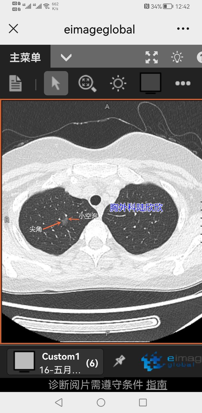 最后,我判断:“这个磨玻璃结节形状不规则,局部突起像是一个尖角,里面有两个发暗的小空泡,基本上像是恶性的磨玻璃结节。尽管这个磨玻璃结节看起来比较淡。但是应该已经突破原位癌的阶段,达到微小浸润性腺癌的阶段。”