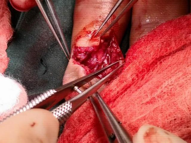 医生先给患者打好了止血带,减少患者的伤口出血。然后开始边清洁伤口,边寻找患者被切断的动脉和神经,找到后先保护起来。因为动脉影响到了手指的供血,如果手术过程中再被损伤,那手术的难度会进一步加大;而神经则影响到手指感觉的恢复,如果破坏严重,就算血管接通,断指能存活,之后也会是麻木而没有正常感觉的。