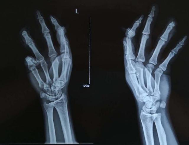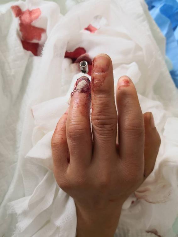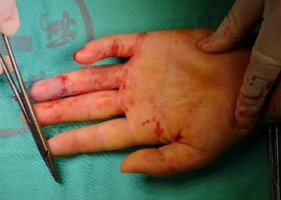 近日,我院接诊了这样一例病人。他的环指末节断开,断端边缘不规则,损伤相对比较严重。这种情况该怎么办?是直接放弃离断的指节直接把伤口闭合还是把断掉的指节再接回去呢?