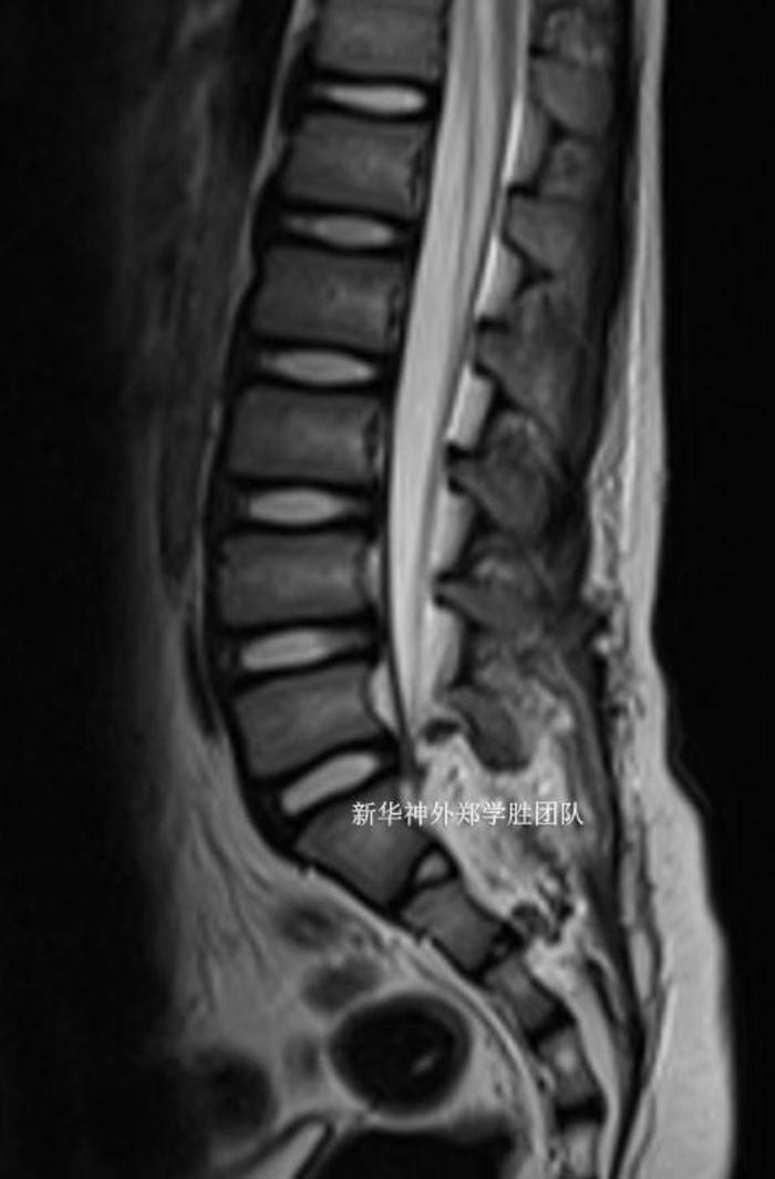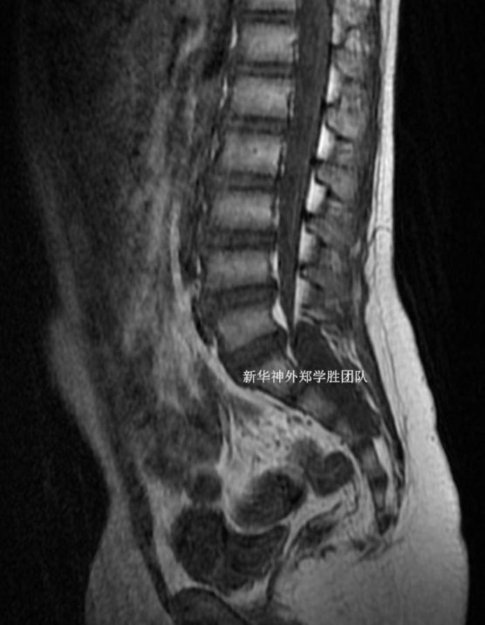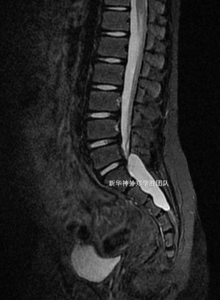 十岁儿童,因为经常腰痛、有时大便困难,检查磁共振发现巨大骶管囊肿,从腰5下缘延伸到骶4上缘。
