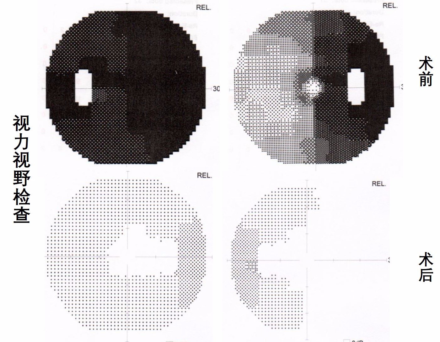 术后患者恢复顺利,视野改善明显,视力无明显变化。患者精神状态较术前明显改善:“是医师帮我从黑暗中解脱出来,重见光明,感谢医生给我发现美的眼睛!”。