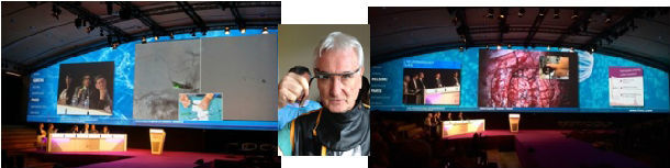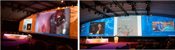 LINNC最大的亮点在于“Live”,今年参与卫星手术转播的单位有法国巴黎第七大学BEAUJON医院、法国Montpellier大学Gui de chauliac医院、瑞士日内瓦大学医院、芬兰赫尔辛基大学中心医院、中国北京宣武医院、巴西圣保罗大学Sirio Libanes医院、巴西圣保罗Albert Einstein医院以及智利圣地亚哥神经外科中心。欧洲、美洲及亚洲的8各团队带来了21场手术转播,均取得了满意的效果。选择的病例既有动脉瘤、动静脉畸形、动脉狭窄闭塞的介入治疗,也有动脉瘤、动静脉畸形的开颅手术。会场的演示效果相当出色,可以同时播放手术实况、术中手部特写、病情介绍幻灯,此外部分手术加入Goolge眼镜技术让与会者感受术者的视野。