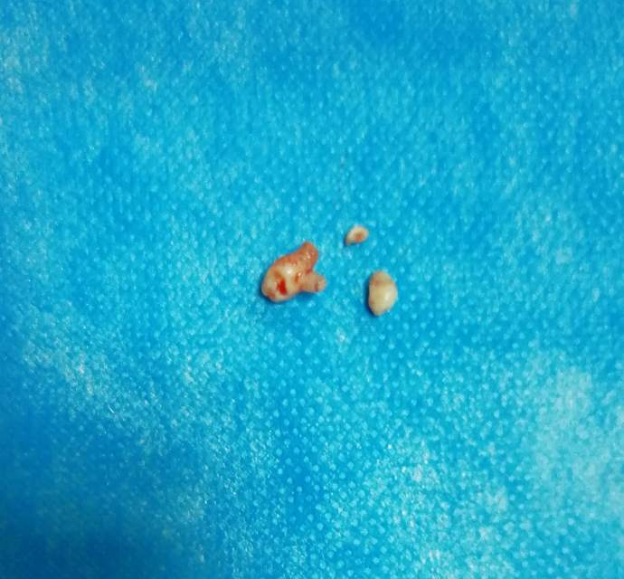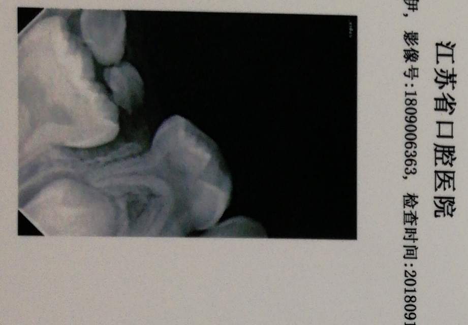 处理:局部麻醉下,切开牙龈,翻瓣,取出钙化物,钙化物是三颗牙齿,见附图