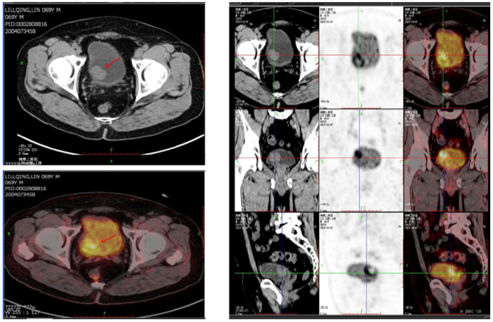 检查后核磁共振显示: 膀胱右后壁可见不规则肿物,约30*20mm大小,浸润肌层可能性大,盆腔未见肿大淋巴结。全身PET-CT显示:1.膀胱肿瘤电切术后改变,膀胱内不规则糖代谢显著增高的高密度影,考虑肿瘤残留。
