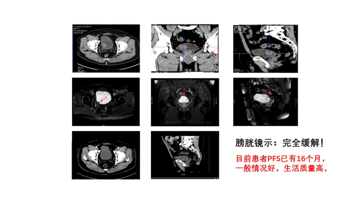 在TURBT+化疗+放疗的经典三联保膀胱综合治疗方案(TMT)之后,王先生的复查结果显示核磁共振: 膀胱充盈良好,膀胱壁均匀稍增厚。膀胱右后壁见宽基底与膀胱壁相连并凸入腔内结节影,12*7mm大小增强扫描明显强化。膀胱周围及盆腔淋巴结无肿大。膀胱镜示完全缓解,目前王先生已经16个月没有复发,一般情况好,生活质量高,已经恢复了正常的工作和生活。