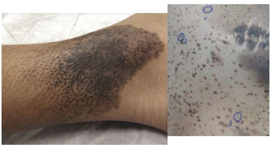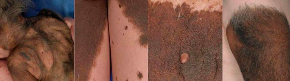 如图所示,一些巨大痣的临床表现比较特别,在大面积褐色的咖啡牛奶斑上散在团块状的黑色斑块,可以伴有毛发生长、结节等表现,国际医学上将这样的黑痣命名为spilus样先天性黑色素痣,由不同的基因突变导致,恶变率也较高,需给予重视!