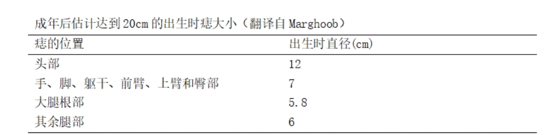 (3)持续观察型:直径较小(估计成年期小于20cm),没有卫星痣;直径过大,目前无治疗手段,建议1年随访1次。