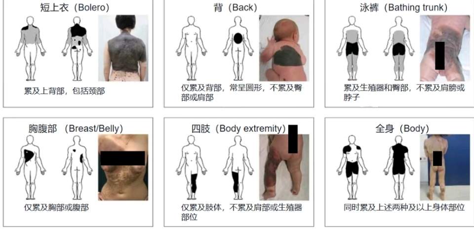 3先天性巨大黑痣,根据体表分布情况,可分为6型(6B分型):