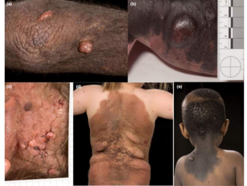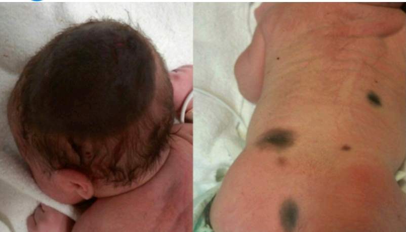 此图是我们团队接诊的一例比较典型的先天性巨大黑痣恶变病例,图显示的是恶变病灶,凸出皮肤表面,颜色鲜红,形状不规则,质地较韧,右边两幅图为切除左图这一恶性的小肉球一年后,在不同部位新长出的恶性包块,质地比较硬,潜伏在皮肤下面。由于目前没有针对性的化疗药物,对这些恶变结节的处理方法都是手术切除。据国外相关研究,20%的黑痣患儿会出现神经发育问题(九院目前收治患儿概率为1%),最常见的有说话延迟,建议定期评估神经发育状况!严重的患儿会出现抽搐、癫痫等神经症状。出现以上情况时,需及时进行头颅核磁共振MRI检查。