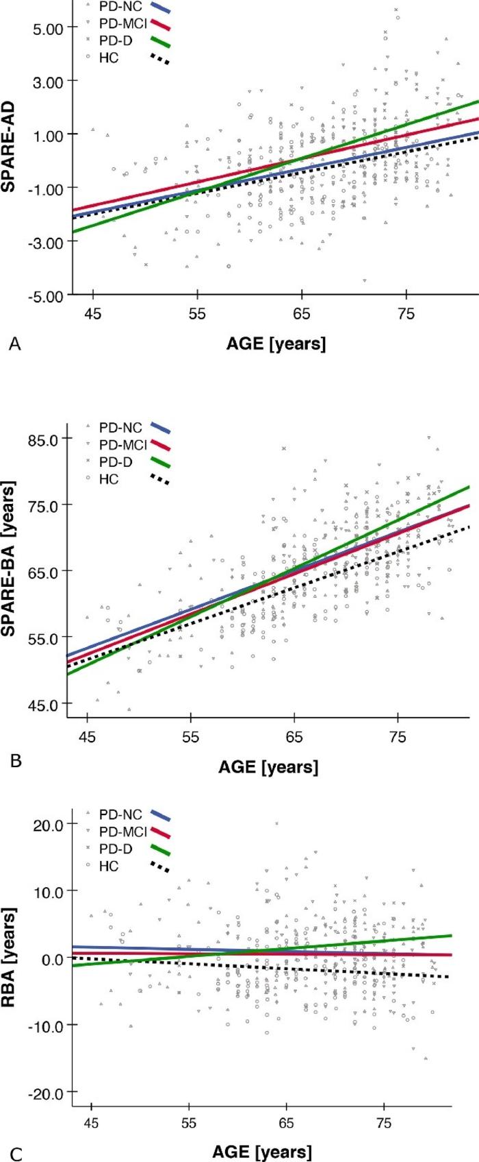 与健康受试者相比,非痴呆的PD患者的RBA增加了2.2年,而PD-D患者则增加至3.5年。