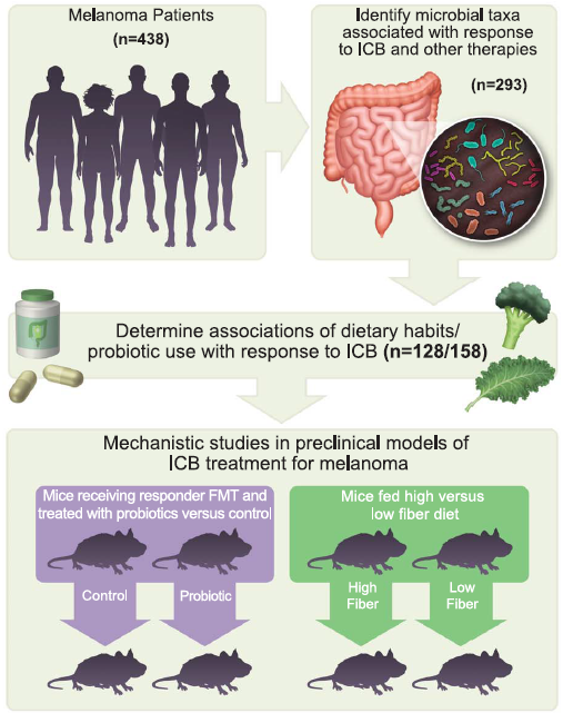 在该研究中,研究人员分析了人类和小鼠肠道微生物群、饮食习惯和益生菌的使用情况对免疫检查点阻滞剂治疗晚期黑色素瘤的影响。
