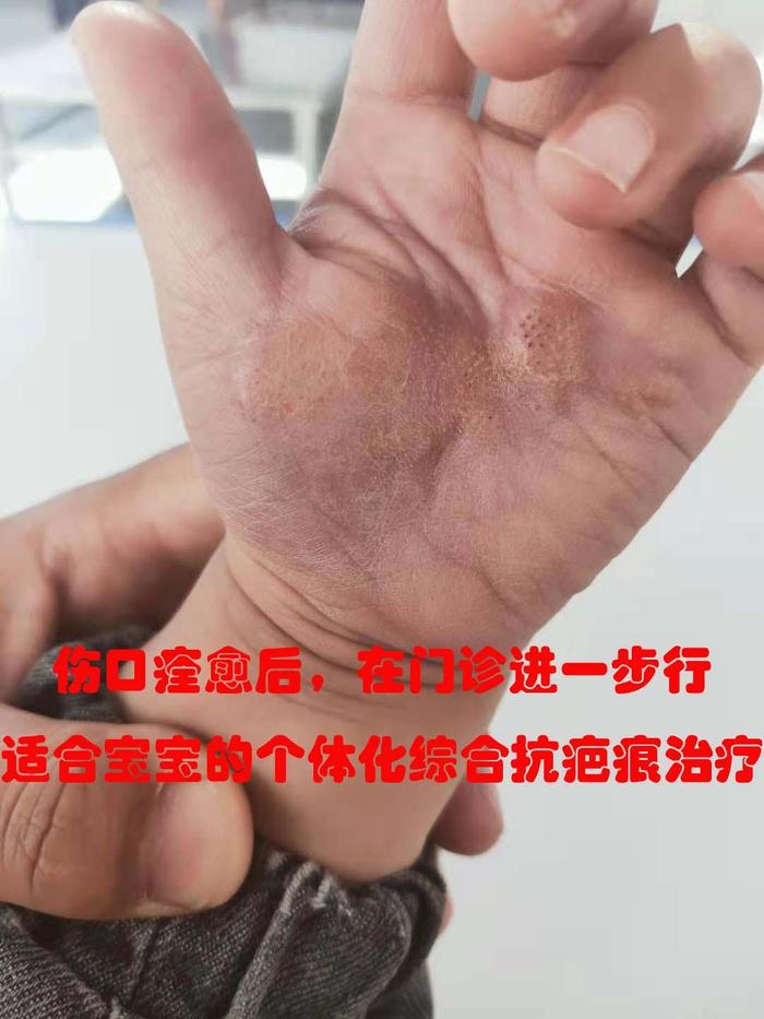 很快伤口在精心换药及对症治疗下痊愈,小孩也没有哭闹,露出久违的微笑,但是小孩手掌重度烫伤很容易遗留瘢痕增生和挛缩,导致手指畸形,不仅仅影响外观和手部功能,还会影响手部发育,对小孩的影响很大。于是,我们根据小孩伤口情况又指定了个体化的综合抗疤痕治疗。