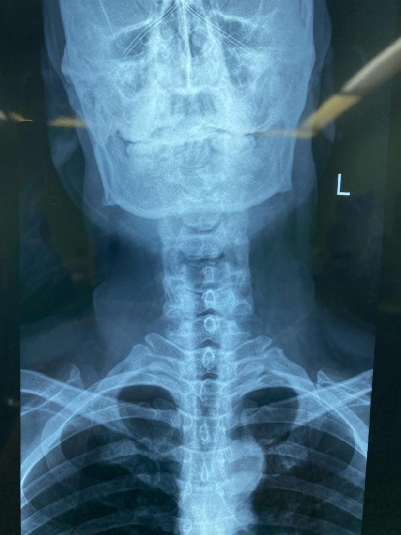 颈椎X线示:由于手臂肩膀疼痛,头偏向一侧