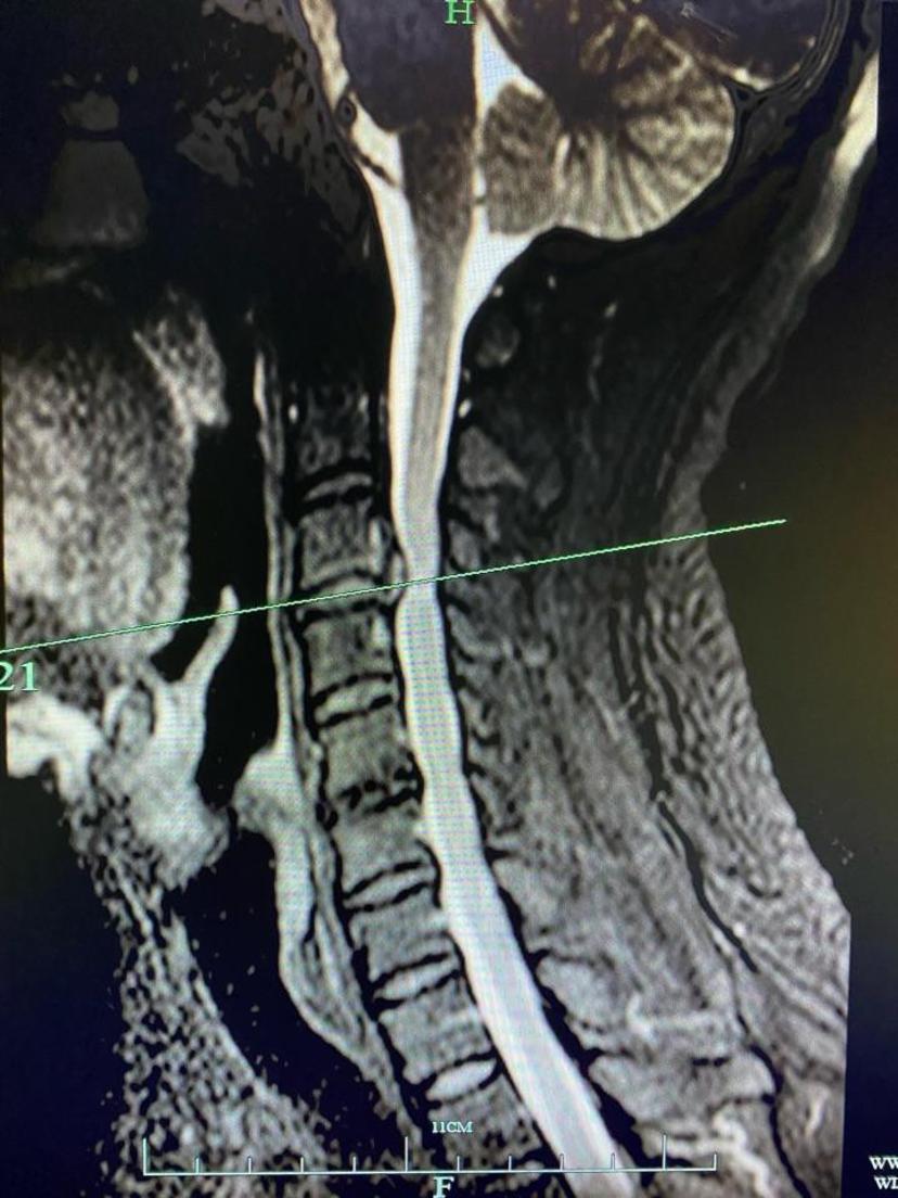 颈椎磁共振平扫示:脊髓神经受压严重,颈椎管狭窄