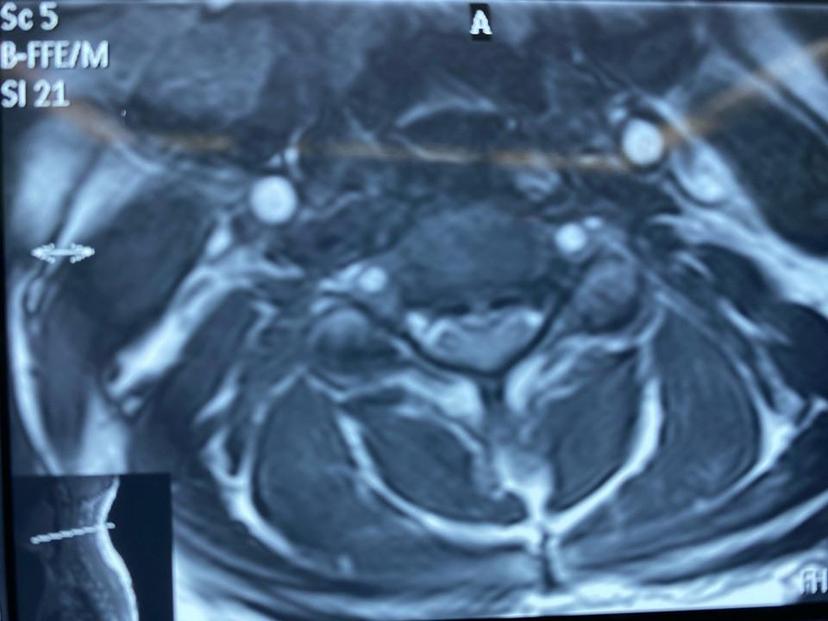 患者,男,30多岁,四肢麻木有7年了,进行性加重,一直没能明确诊断,近两个月来走路很吃力,双下肢紧绷感,走路摇摇晃晃,一不小心就摔跤,就诊我门诊后经磁共振检查示:高位颈椎病(颈3-4椎间盘突出、脊髓严重受压变细、脊髓变性),采用前路ACDF微创术式,术程1小时、出血约20ml、切口长约2.5cm,术后第一天感觉到双手轻松了很多,术后第二天正常下地走路,对比了术前术后走路的感觉,明显感觉到腿脚利索有力了,走路较术前稳当很多,术后第三天出院。温馨提醒:脊髓损伤严重、脊髓变性大部分是不可逆的,颈椎病发展到踩棉花感、走路不稳等情况请尽早就医,以免耽误病情。颈椎磁共振示:高位颈椎间盘突出,脊髓受压严重,脊髓变性