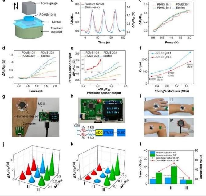 柔性电子传感技术融合了材料科学、微电子学和生物科学等,广泛地应用于人机交互,软体机器人和健康监测中,是人工智能、精准医疗战略前沿的先导和基础。智能化、微型化、低功耗、高灵敏度和高可靠性是柔性电子传感器件的特点。基于此技术,我们研发了一款用于检测皮肤弹性和硬度的传感器,其具有体积小、可拉伸,易贴合的特点,更适用于人体皮肤的复杂状况。该硬度传感器集成了基于聚二甲基硅氧烷材料的应变传感器和压力传感器,在外力下硬度传感器可随着接触材料变形而变形。