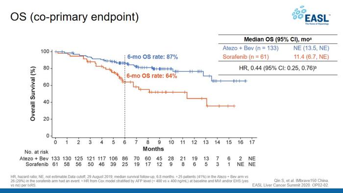 IMbrave150试验是一项跨国多中心的Ⅲ期试验,总共入组了501例患者,按照2:1的比例分配到T+A免疫联合治疗组和索拉非尼单药治疗组。 与索拉非尼相比,阿替利珠单抗与贝伐珠单抗免疫联合疗法使得患者死亡风险降低42%,同时使得疾病恶化或死亡风险降低41%,研究发现,索拉非尼组的中位OS约13个月,而阿替利珠单抗+贝伐珠单抗组的死亡风险显著下降42%。而在本次NEJM正式刊发的论文中,揭晓了备受瞩目的患者12个月生存率(12 Month OS%)数据:T+A免疫联合治疗组患者,12个月生存率达到67.2%。这一数据,也成功突破了不可切除肝癌一线治疗生存期的瓶颈。