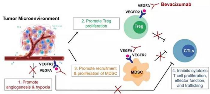 贝伐珠单抗是一种血管生成抑制剂(VEGF抗体),既往主要用于晚期转移性结直肠癌的靶向治疗。贝伐单抗能够通过阻断肿瘤VEGFA/VEGFR2通路,不仅能够抑制肿瘤新生血管生成,还能够抑制肿瘤诱导的调节性T细胞增殖,并通过抑制肿瘤表达的VEGF信号克服其诱导的肿瘤免疫抑制,与阿替利珠单抗联用能够大大提高抗肿瘤治疗疗效。