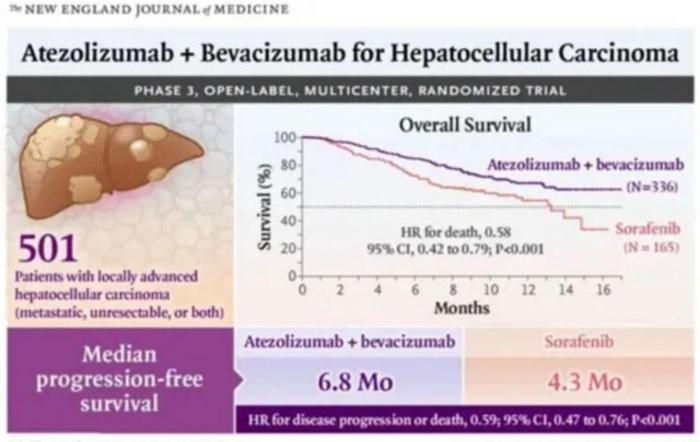 2020年5月14日,也就是几天前,肝癌治疗领域也发生了一件具有里程碑意义的大事件——《新英格兰医学杂志》(NEJM)发表了一项肝细胞癌的3期临床试验IMbrave150结果[1]。这项研究关乎全世界百万肝癌患者的性命,因为它在未来将改变不能手术切除的晚期肝癌的一线标准治疗。阿替利珠单抗联合贝伐珠单抗这一双剑合璧的靶向免疫治疗新疗法,与目前标准的一线治疗索拉非尼相比,能降低晚期肝癌患者42%的死亡风险!