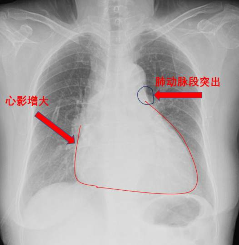 当天120急救送到了我们科室。只见王阿姨表情痛苦,口唇、指端明显紫绀,气喘得不能讲话,端坐在床上,无法躺平,双腿肿的很厉害。心率116次/分,血压90/50mmHg,血氧饱和度80-85%。急查血,氧分压49.4mmHg,心衰指标(NT-proBNP):15378pg/ml,D-二聚体:4219ng/ml,心电图示窦性心动过速。胸片提示肺动脉段突出,心影明显增大(图1)。