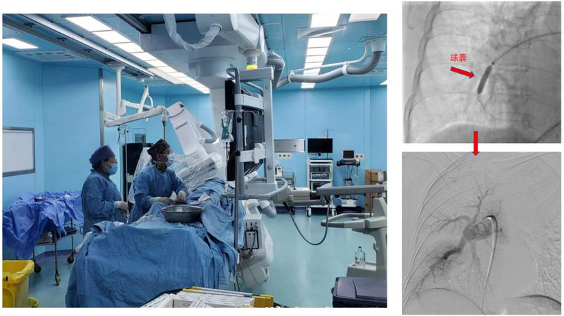 图6 左图为宫主任正在为患者做球囊扩张术,右侧上图为球囊扩张术中图,右侧下图为球囊扩张术后图