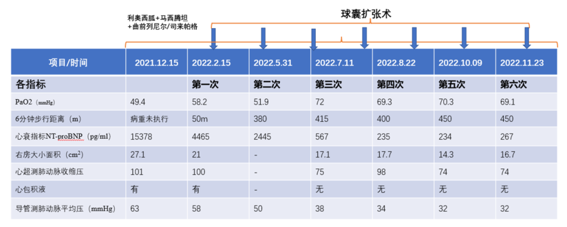 吸栓后患者胸闷、气促较前有好转,考虑到重度肺动脉高压,右心功能明显减退,病情危重,与家属沟通后,予加用曲前列尼尔+利奥西呱+马西腾坦三联靶向降压,同时予强心、利尿支持治疗。3个月后,王阿姨自觉胸闷、气喘较前有好转,可以平步行走,但是6分钟步行距离仍然小于50米,氧分压为58.2mmHg,NT-proBNP降低至4465pg/ml,她自觉病情改善不满意。与王阿姨家属沟通后,6个月,每月执行一次肺动脉球囊扩张术(球囊扩张术、BPA)。最后一次球囊扩张术结束后,王阿姨已经像换了个人一样,几乎感觉不到胸闷、气喘,基本恢复了生病前的状态。用她的话说,她不仅捡回了一条命,而且还能像正常人一样做饭干家务,完全超出了自己跟家人的预期,球囊扩张术太神了。