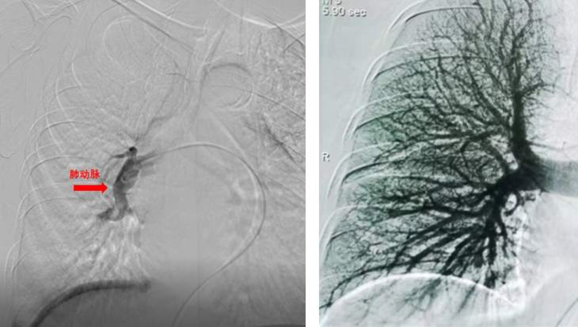 图4 左图为本患者肺动脉造影图,右图为正常肺动脉造影参考图