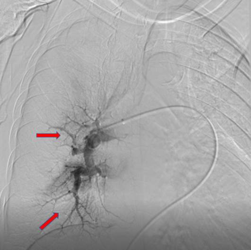 综合以上情况,考虑肺栓塞(考虑慢性肺血栓,本次急性发作)、慢性血栓栓塞性肺动脉高压、心力衰竭、呼吸衰竭诊断,病情危重,随时可能猝死。考虑血栓负荷大,给与肺动脉吸栓术,术后右肺动脉叶段多支显影,见下图。