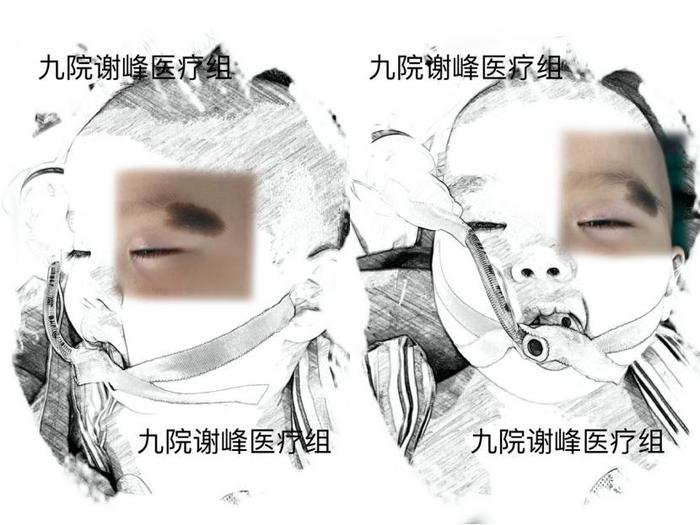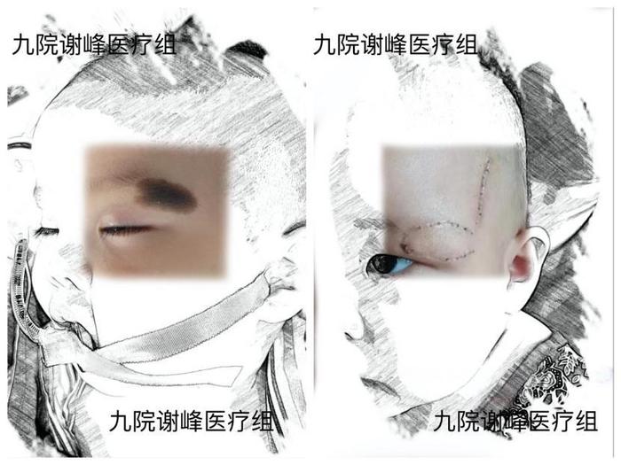 最后我们比较一下刚拆完线的宝宝的黑痣修复效果。可以看到眉毛眼睛几乎没有变形,原来的黑痣区域被替代成了一块颜色质地都非常接近的皮肤。在术后配合疤痕的护理和以后的种眉治疗,就可以达到非常好的外观。