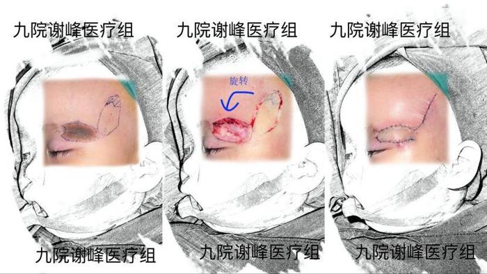 图中显示的就是我们补切除掉的黑痣的过程。在宝宝的太阳穴部位设计了一个和黑痣相同大小的皮肤(确切的说叫“皮瓣”),将这块颜色和质地以及厚度都非常接近上睑皮肤的“供区”材料给旋转90度,把切完黑痣产生的缺损给补齐,并且调整局部结构,使眼睛和眉毛都不会因此变形。最后我们非常精细把伤口缝合完成。
