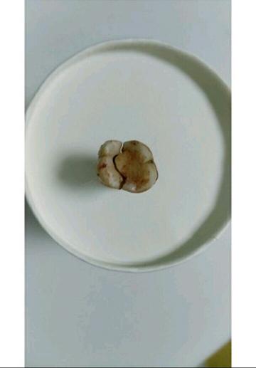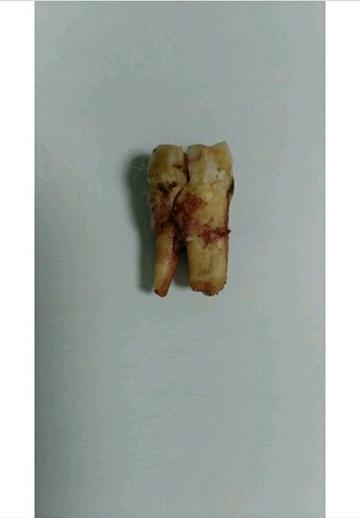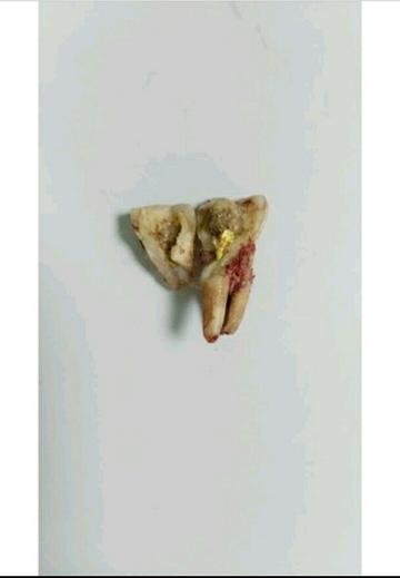 患者就诊时诉,大约一个月前右上后牙(17)因牙隐裂,引起牙髓炎,做了根管治疗,医嘱让她做牙套保护,患者觉得牙齿不疼了,平安无事了,加上春节耽搁,一时疏忽,没能及时做牙套,结果这个牙裂开了,只能拔掉!