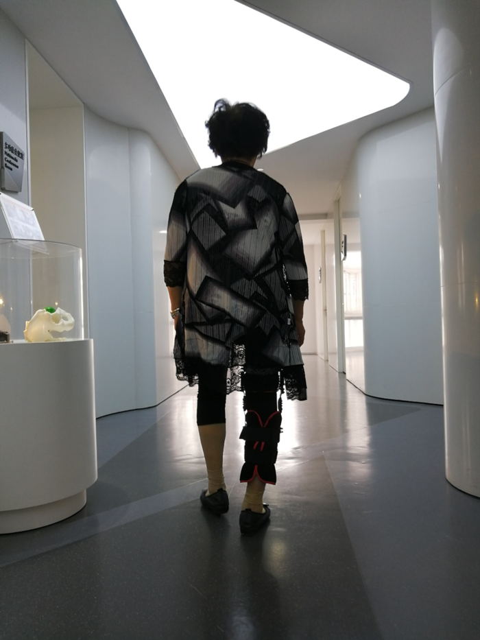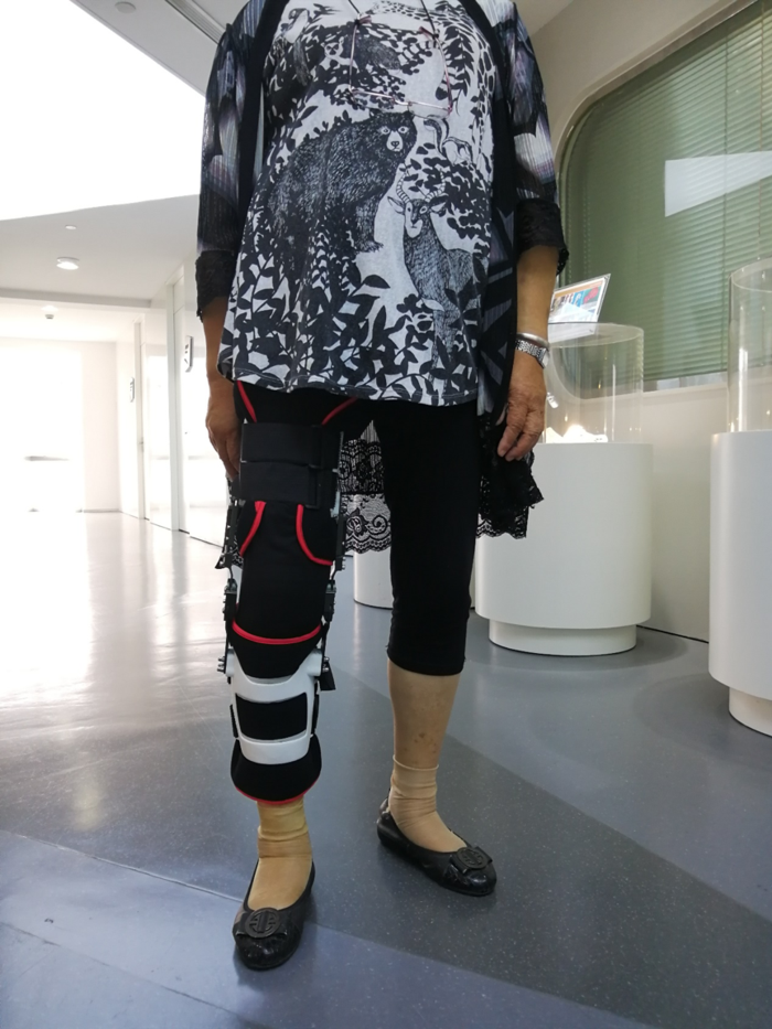 患者在正确穿戴膝关节矫形器后,于门诊走廊上来回行走,不断适应矫形器的同时,也对矫形器能为下肢减轻疼痛而感到十分满意。