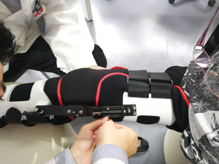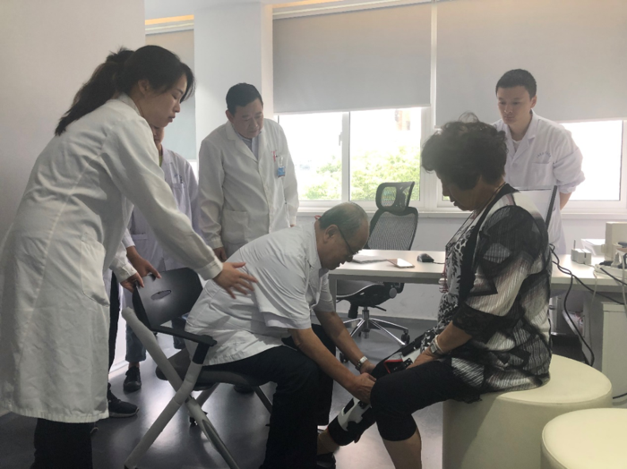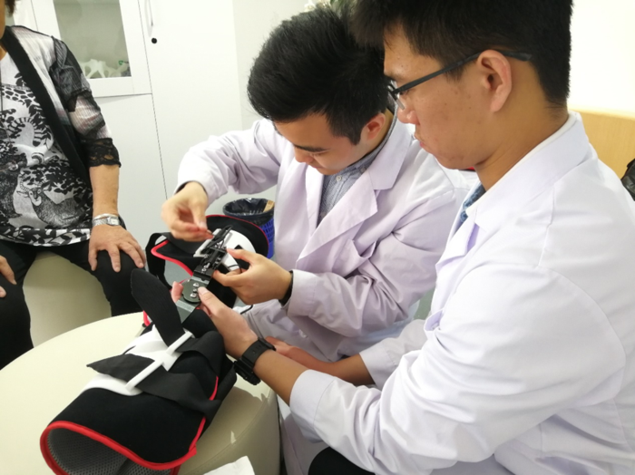 患者于2019年9月前往3D打印中心适配定制式增材制造膝关节矫形器。王金武教授及团队工程师、矫形器师及治疗师一同观察患者适配情况,并对矫形器做出适当调整,同时为患者详细地介绍矫形器的正确穿戴方法及注意事项。