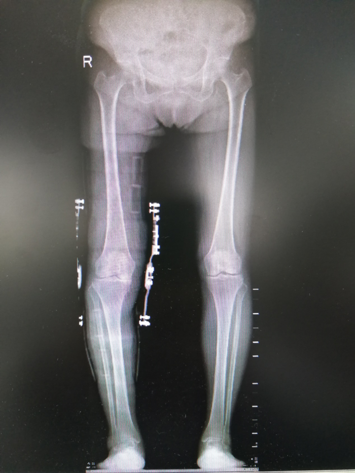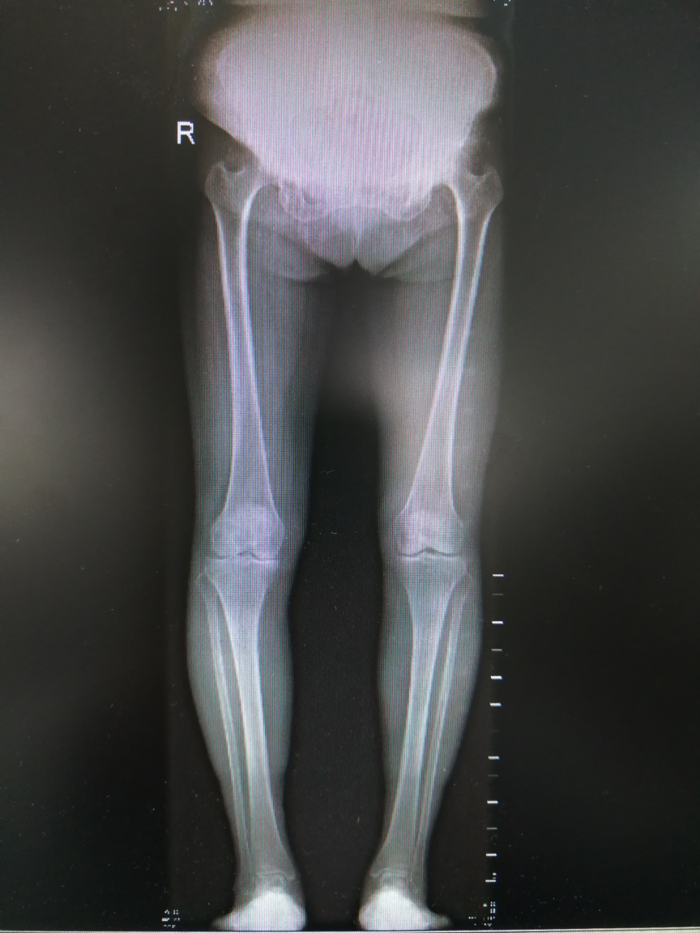 下图为患者穿戴矫形器的双下肢力线全长X光片