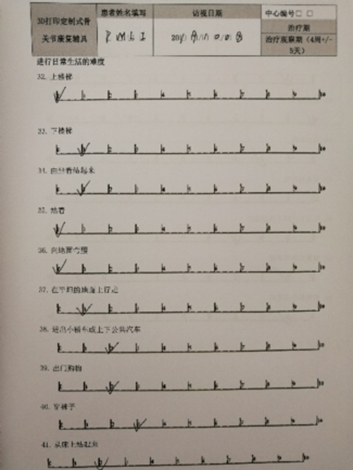 潘阿姨在佩戴个性化膝关节矫形器4周后,WOMAC骨性关节炎指数评分表得分由治疗前的40分降为26分,疼痛明显缓解,日常生活活动能力明显提高。