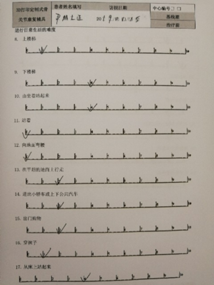 昔日曾经喜欢爬山涉水外出旅行的潘阿姨于2018年8月30日因近3年右膝关节疼痛,来我院骨科就诊,行一段时间常规治疗后,疼痛无明显缓解,她只好放弃自己外出徒步旅行的爱好,渐渐随着活动减少,体重不断增加,年底例行查体医生告诉她要警惕高血压及糖尿病的状况,嘱咐她适当注意控制体重,避免过度肥胖。后于2019年01月15日来我院3D打印中心就诊,行影像学检查,结果:双下肢欠对称、构成诸骨骨质增生,双膝关节间隙狭窄,右膝为著,关节面毛糙,关节面下骨质密度不均。医生为患者评定WOMAC骨性关节炎指数,得分为40分。