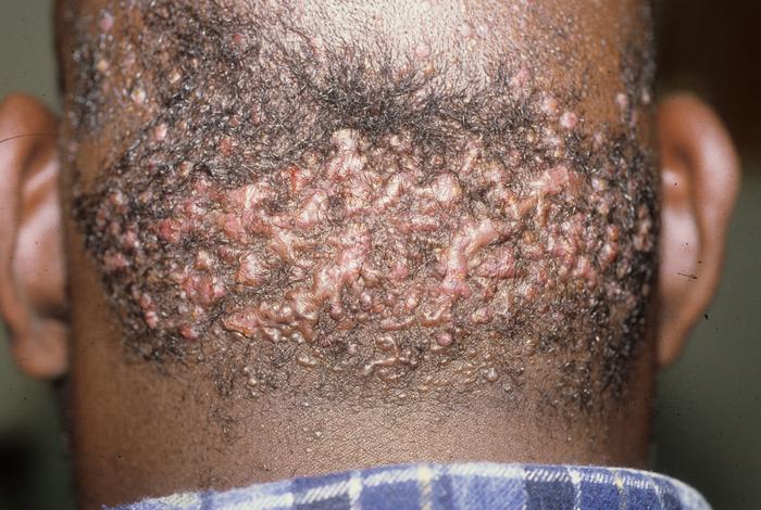 该病病因尚不清楚,可能与剃发不当、薅拽头发、衣物摩擦等慢性刺激或毛囊闭塞有关。因此,日常生活中需要避免衣领和头盔摩擦,留短发,使用抗菌洗发剂等减少继发感染。