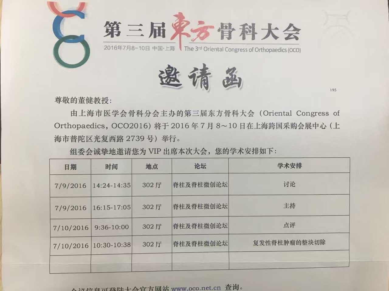 董健教授受邀参加第三届东方骨科大会 2018年07月10日 7155人阅读 返回文章列表 由上海市医学会骨科分会主办的第三届东方骨科大会于2016年7月8日-10日在上海跨国采购会展中心举行,组委会邀请董健教授作为VIP出席本次大会,并作大会发言《复发性脊柱肿瘤的整块切除》,受到了同行的热烈反响及高度认可,大会期间同时担任脊柱及脊柱微创论坛部分章节的主持,讨论以及点评工作。复旦大学附属中山医院脊柱外科董健 顶 0 分享到: