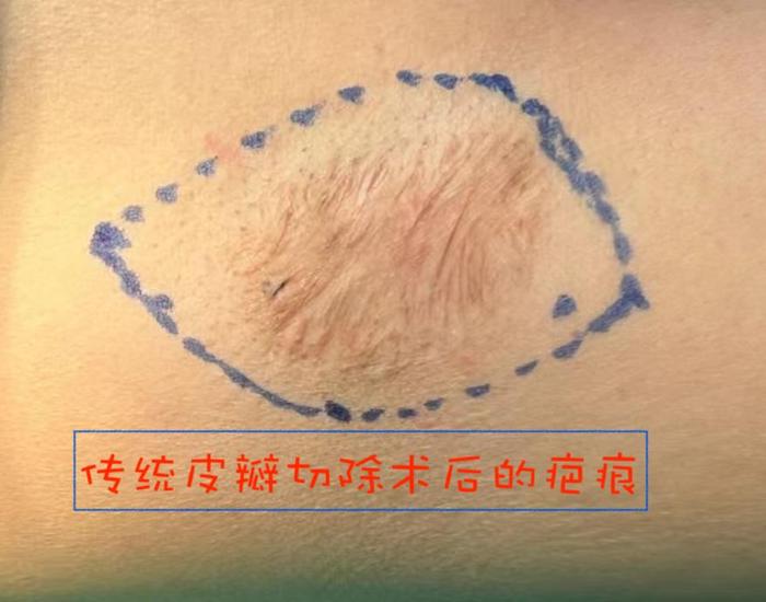 可能有些患者的愈合和上图不像,这和手术,伤口恢复以及本身的肤质相关。理论上,手术切口的张力越大,约容易形成疤痕。像传统的皮瓣切除手术后,将伤口拉拢缝合起来具有较大的张力,因此在术后疤痕会逐渐形成。如下图
