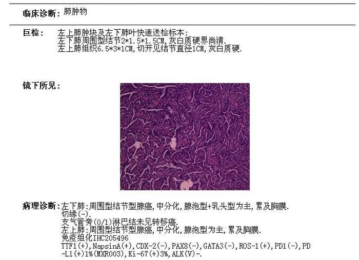 这两个结节都侵犯胸膜,术后需要化疗或靶向治疗。左下肺混合磨玻璃结节的Ki-67为3%,说明这个结节长得比较慢,与两年来的CT表现一致。术中清扫的淋巴结病理在另外一张病理报告上。