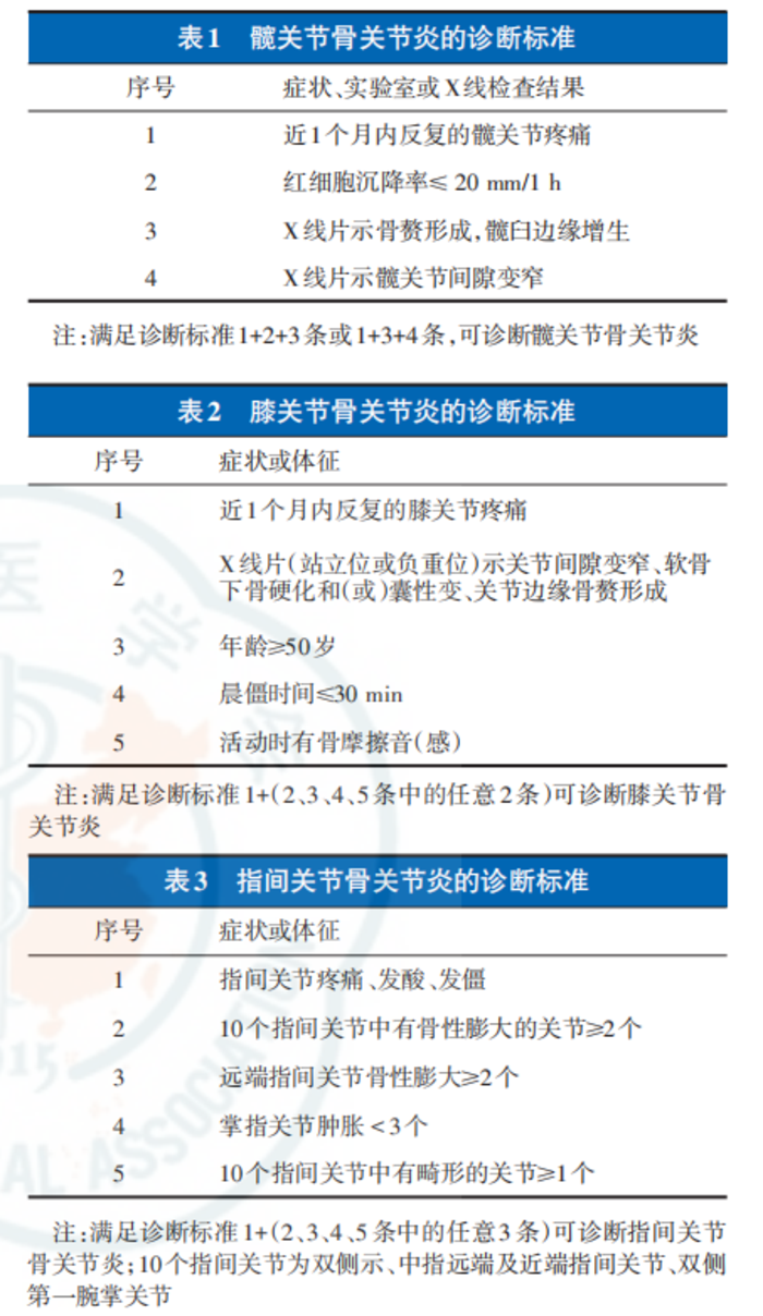 OA 的诊断主要依据病史、症状、体征和影像学检查等做出临床诊断。实验室检查主要用于OA的鉴别诊断。《骨关节炎诊疗指南(2018)》推荐了髋关节、膝关节和指间关节OA的诊断标准以供参考[3]。具体标准见下图: