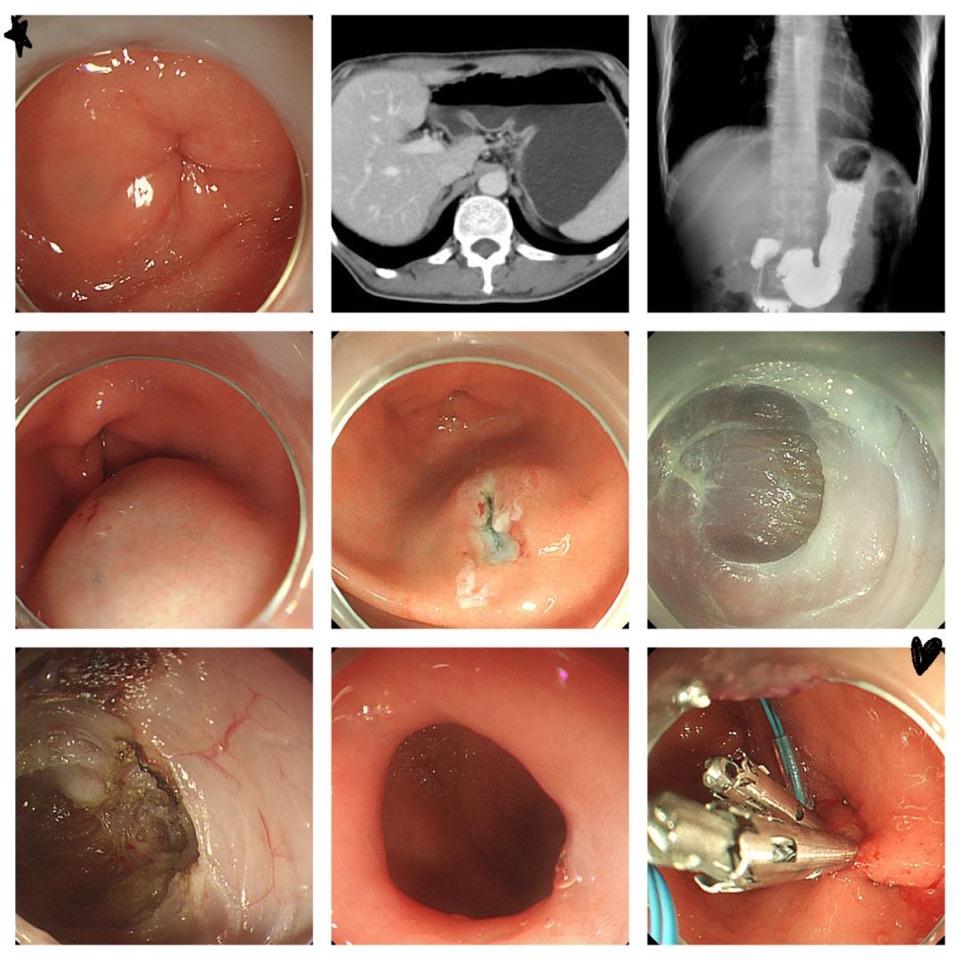 图释:术前内镜检查提示幽门口痉挛紧闭,空腹CT提示胃内容物多,胃潴留;消化道造影提示胃内造影剂滞留。行G-POEM手术后,再次观察:幽门明显增大。
