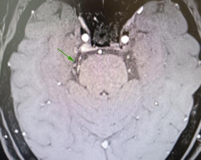 术前MRI显示:右侧三叉神经旁边有血管影