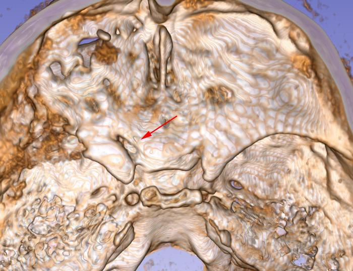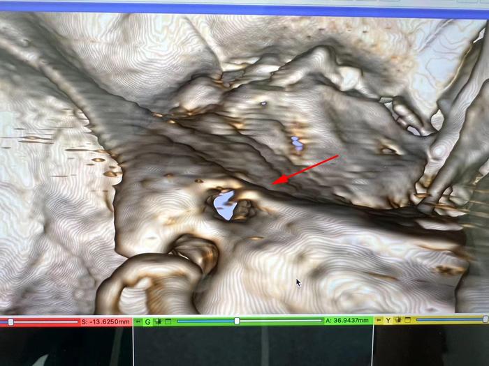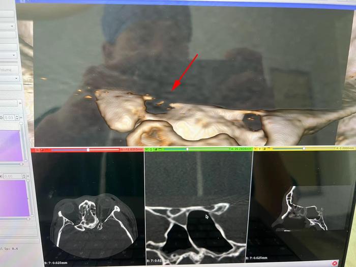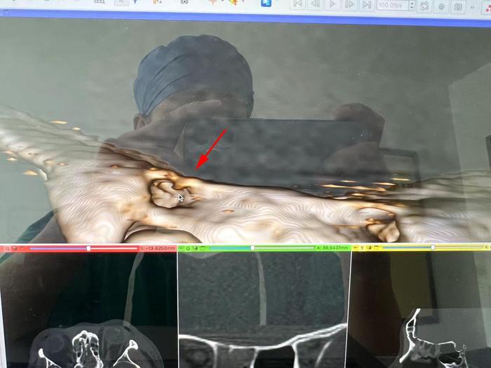 鉴于患者左眼完全失明,临床上高度怀疑可能存在左侧视神经管骨折;因此李帅医生紧急汇报郑学胜主任;郑主任仔细阅片后,发现左侧视神经肿胀明显,予以影像三维重建,结果显示,左侧视神经管上壁有骨折线,视神经管眶口有一个小骨折片;因此有明确手术指征。
