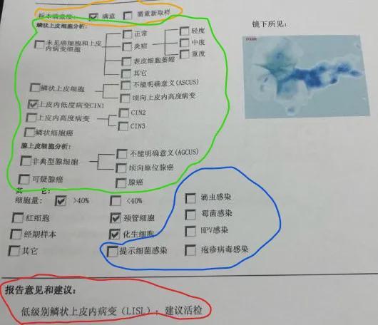■ 宫颈微生物情况,也就是上图中用蓝色圈出的部分,TCT检查不仅仅能筛查宫颈癌,还能查滴虫、霉菌等病原微生物感染。如果存在感染的情况,医生就会在相应的病原体那一栏打勾。