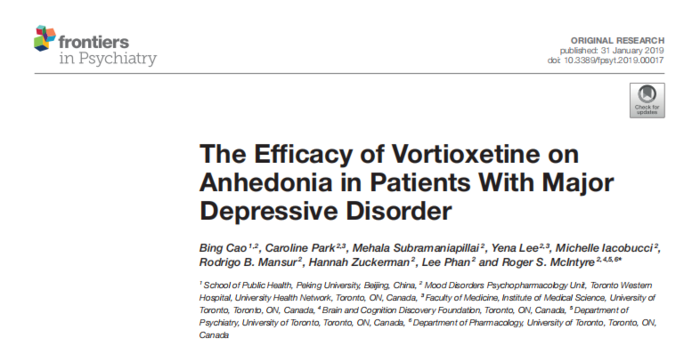 Cao, B., Park, C., Subramaniapillai, M., Lee, Y., Iacobucci, M., Mansur, R. B., Zuckerman, H., Phan, L., & McIntyre, R. S. (2019). The Efficacy of Vortioxetine on Anhedonia in Patients With Major Depressive Disorder. Frontiers in psychiatry, 10, 17. https://doi.org/10.3389/fpsyt.2019.00017